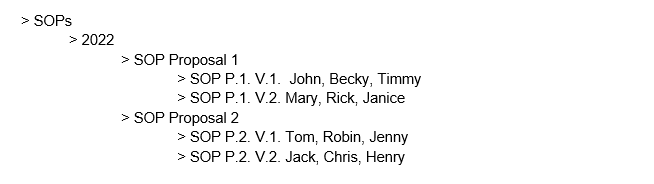 Notice that files and names categorize year, proposals, versions, and even editors assigned to each document, which we’ll talk more about later. Using an easy-to-read format like this, you’ll always be able to pinpoint which file is which.