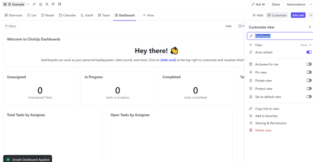 One of ClickUp’s standout features is its highly customizable dashboards. Users can tailor their workspaces to fit their team’s specific needs, choosing which tasks, goals, time-tracking, or reports to display. The platform is flexible enough to accommodate different industries, including marketing, software development, and human resources.