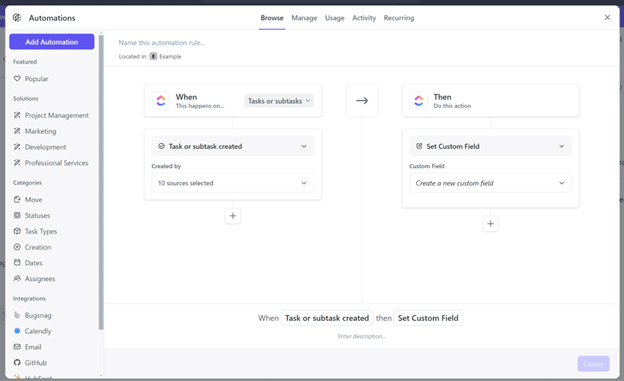 ClickUp’s automation tools help teams reduce time spent on repetitive tasks. Using simple “if this, then that” rules, teams can automate actions like creating tasks, updating statuses, and notifying team members.