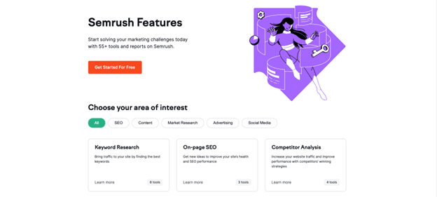 SemRush is a robust software program that gives marketers massive opportunities to improve a brand’s online visibility. It helps with everything from making content to overseeing and evaluating it across various channels. It helps you increase your SEO with on-page analysis, keyword search, and much more. The platform is robust and has a free trial to get you started.