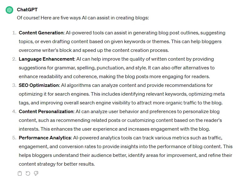 ChatGPT is a great tool to use to draft content such as blog posts and articles, which then allows the user to easily overcome writer’s block by having something to work with. For example, we asked ChatGPT to give us a list of 5 ways AI can help create blogs. Here’s the response we got: