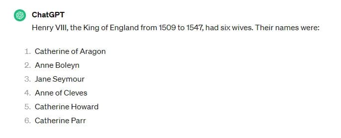 ChatGPT is also a very handy tool for research, although it may not always be 100% accurate and anything it states needs to be double-checked. In this example, we asked ChatGPT how many wives Henry VIII had. Here’s the response: