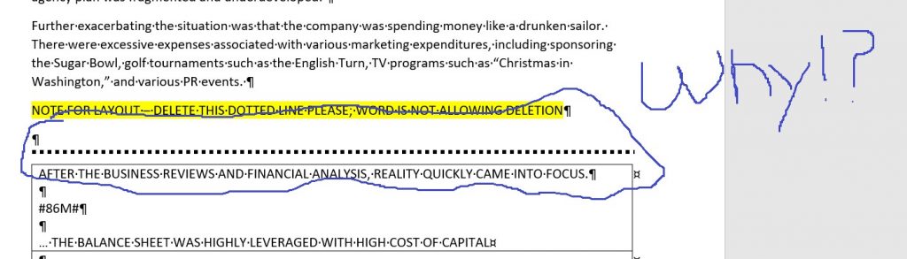 Recently, we had a long document that had several dotted lines running across the page. We had no idea how they got there. Several writers tried to remove them, but it wasn’t until months later that one of them succeeded. It turns out that fixing this issue is pretty simple. Just follow these steps below: 1. Copy the area surrounding the line, inclu...