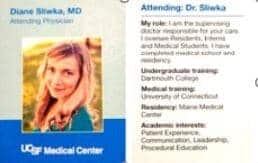 These cards include a photograph of the doctor, along with a description of their role and their contact information. These cards help patients to keep track of who is who within their medical team and what each of them is responsible for.