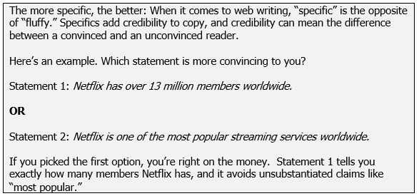 Good web writing should tell your customers what they want to know in the first two sentences. Remember, website visitors come to a site to gather information. If they have to read paragraphs of unnecessary fluff to get to the “meat” of your product or service, they’ll probably move on.