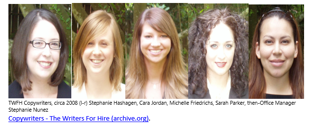 The young writing agency’s site became thewritersforhire.com, and TWFH blossomed, adding more writers as it added more clients.