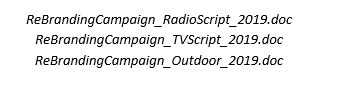 For example, letโs say the ad agency created a comprehensive branding campaign for client ABC. The campaign encompasses radio, television, and outdoor advertising. They might consider using names like these and placing all of the documents into a folder labeled ClientABC: