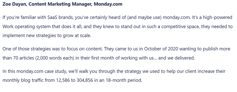 Include a prominent โ€œsnapshotโ€ of the case study results at the beginning. This immediately puts the focus on your client and tells readers what theyโ€™ll learn. You can do this with: