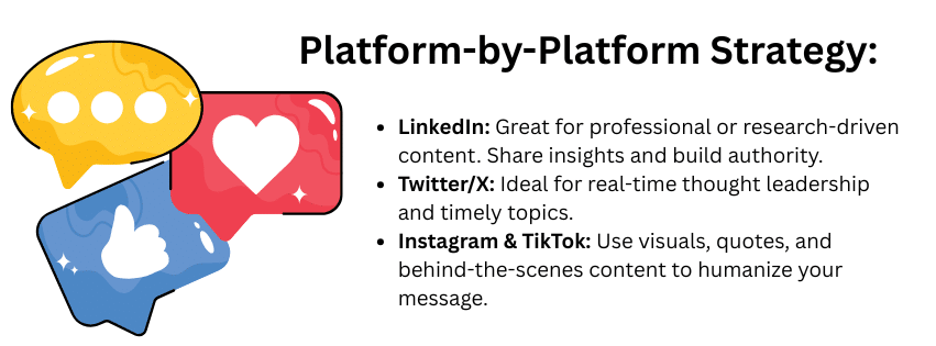 You don’t have to generate all the content yourself, either. A ghostwriter or content collaborator can help craft posts that reflect your tone and purpose without sounding stiff or scripted. They can also help maintain rhythm and voice across channels, so your audience experiences consistency no matter where they find you.