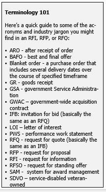 Note: an RFQ is essentially the same as an IFB, or “invitation for bid” — don’t let the names throw you off. They’re asking for the same thing.