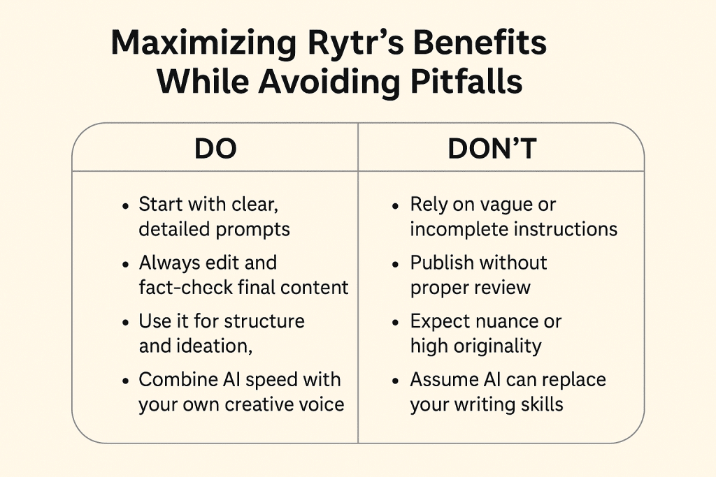 The chart below highlights best practices for using Rytr effectively, showcasing key “Dos and Don’ts” to help users maximize its benefits while avoiding common pitfalls.