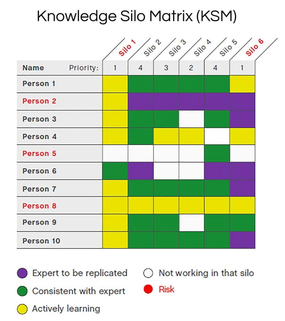 “Our Knowledge Silo Matrix helps the organization ask its managers who does what best,” says Sonja Gustafson, director of marketing. “From the examination of these key experts will arise skillsets that may need to be transferred.”
