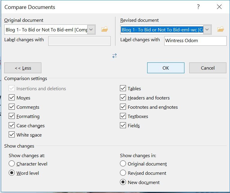 5. Click OK. Word will display a side-by-side comparison and a list of revisions.