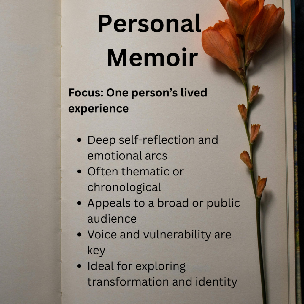 A personal memoir centers on an individual’s lived experience. It may follow a chronological path, explore a specific chapter of life (such as surviving an illness or building a career), or revolve around a theme like identity, loss, or resilience.
